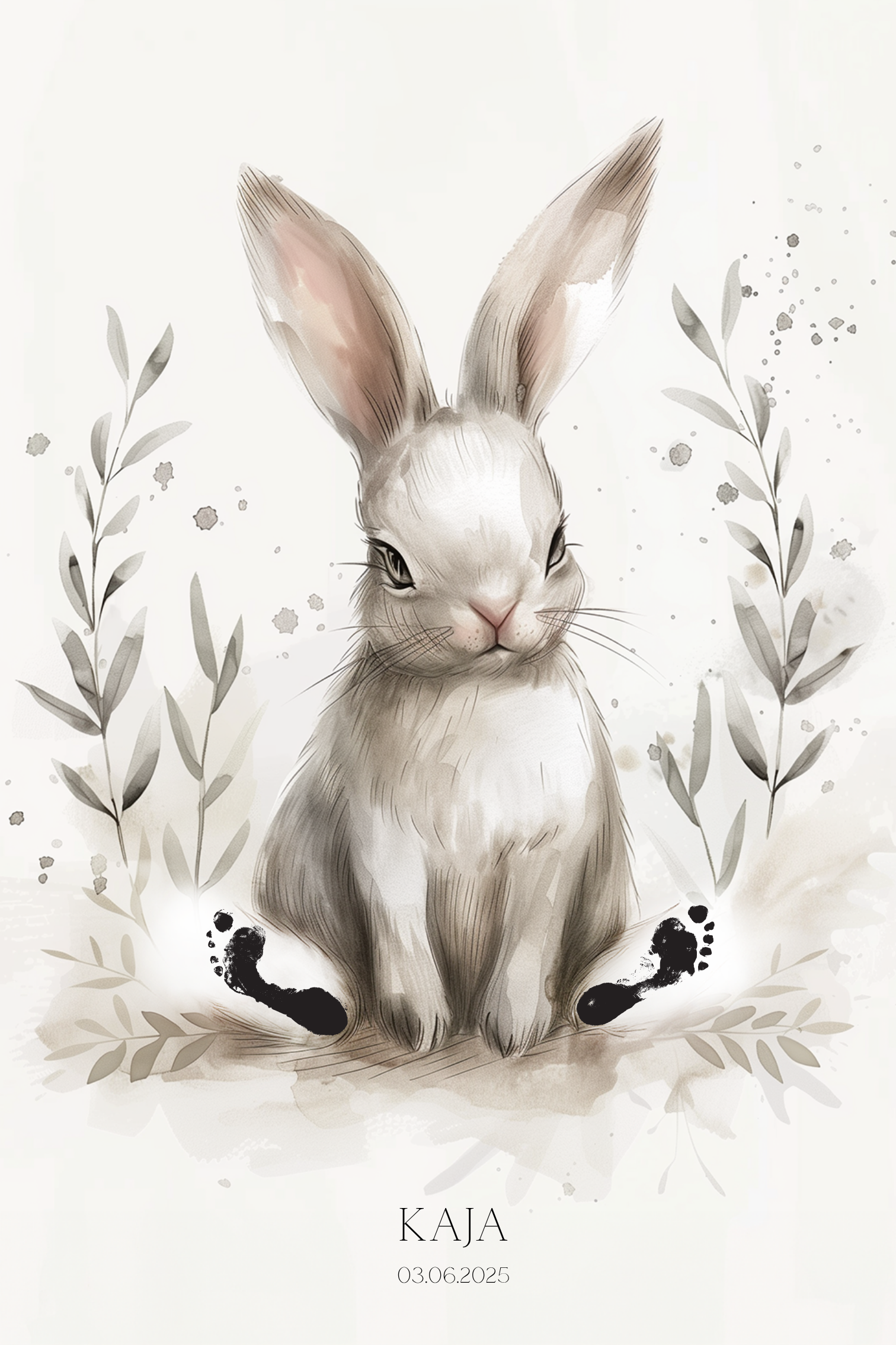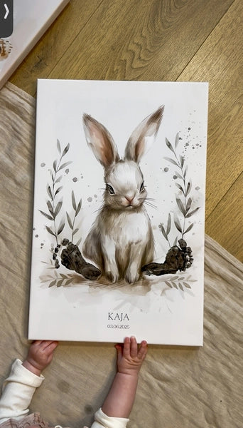 Obraz na płótnie — królik z odciskami stópek i personalizacją dla dziecka