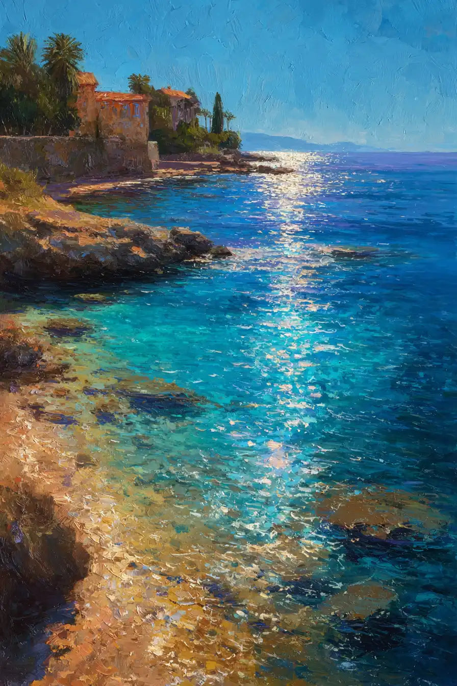 ✅ Śródziemnomorski motyw — błękitna woda, czerwone dachy i palmy w słonecznym świetle