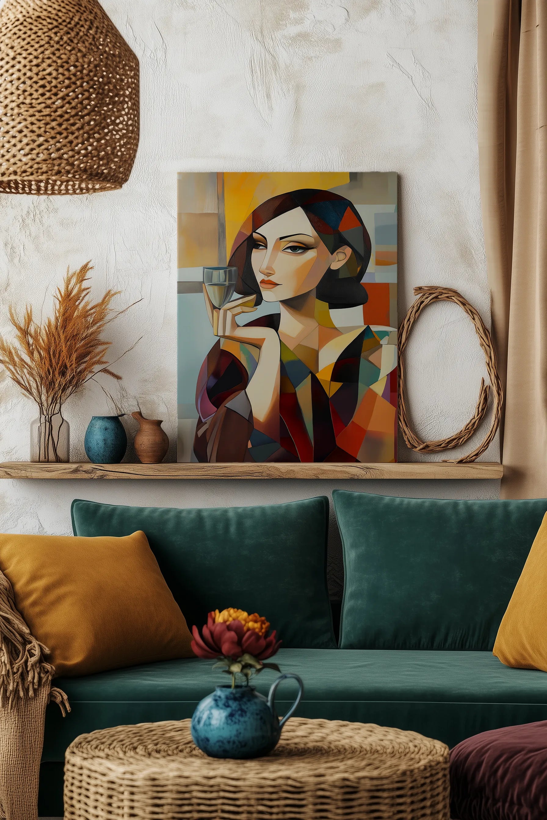 ✅ Wyrazista kompozycja z kubistycznym portretem i kieliszkiem — sztuka z charakterem