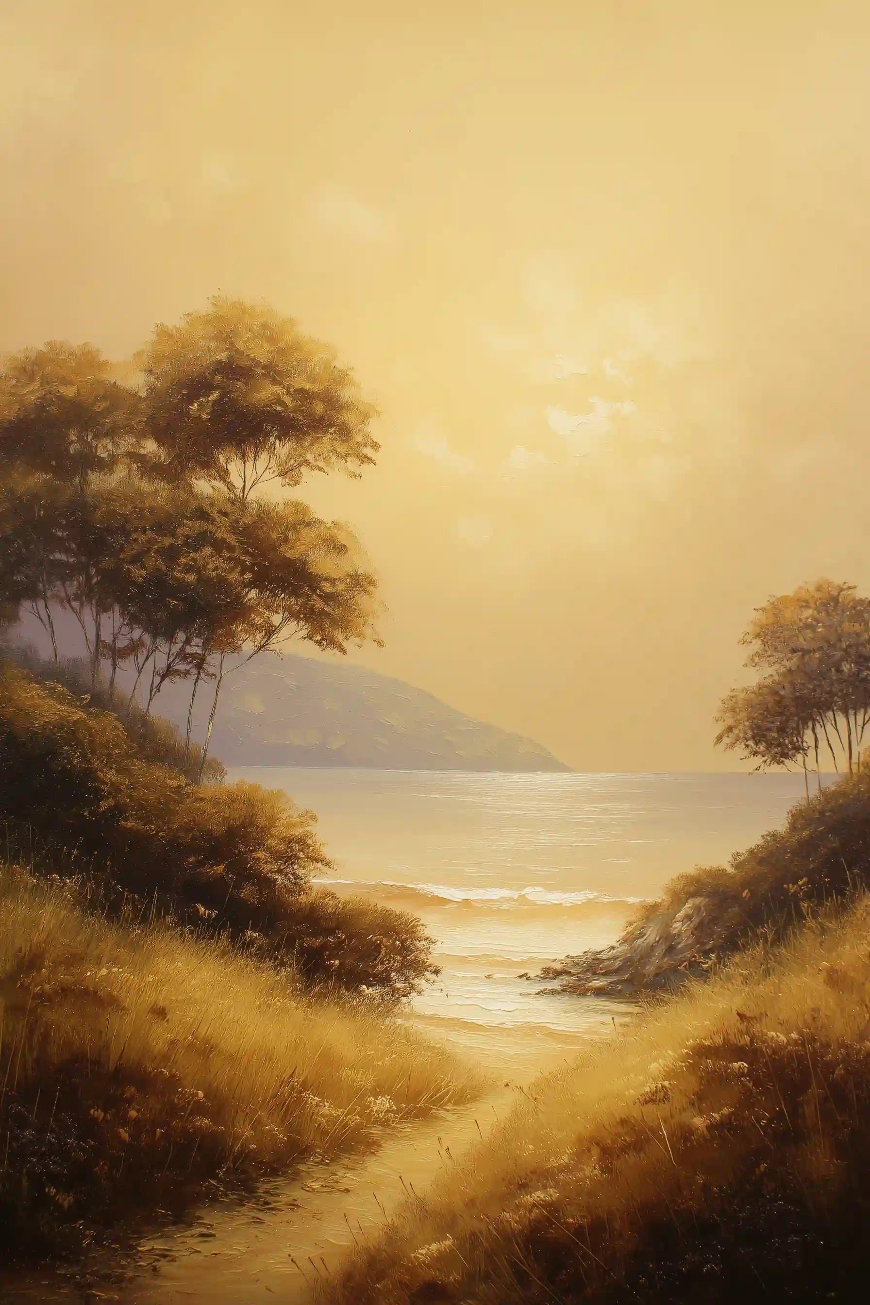 Obraz na płótnie stworzony z myślą o wnętrzach, które cenią spokój, ciepło i naturalne piękno. Nadmorska ścieżka w otoczeniu drzew i wody wnosi do przestrzeni harmonię, nostalgię i światło.