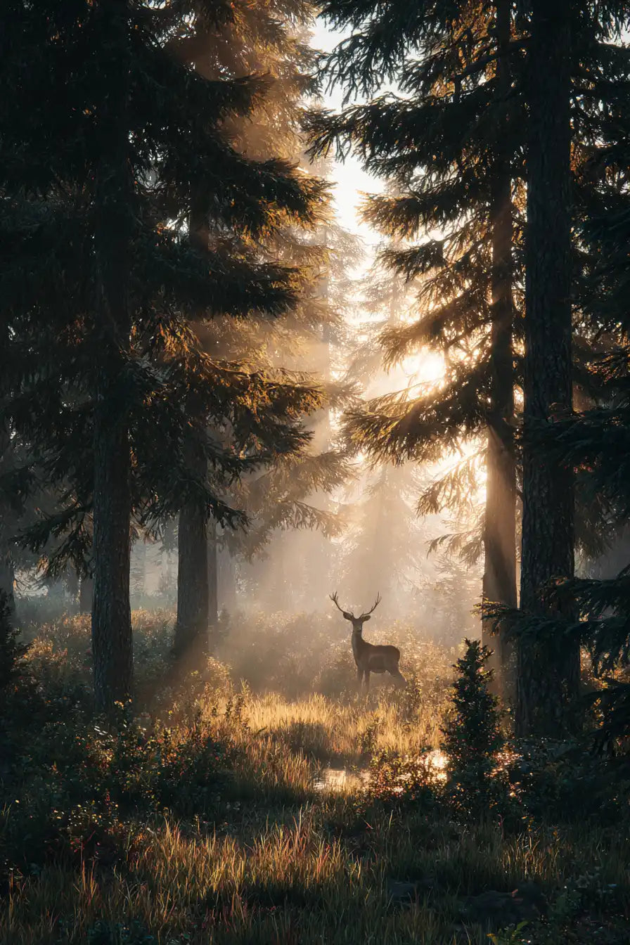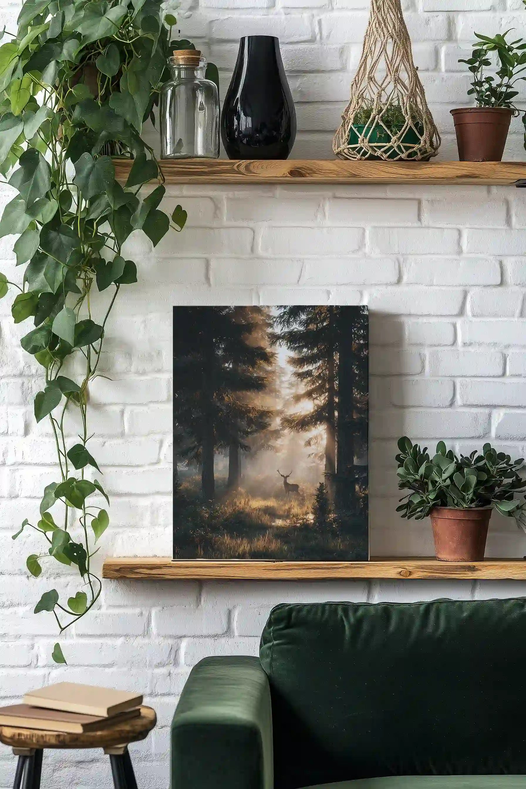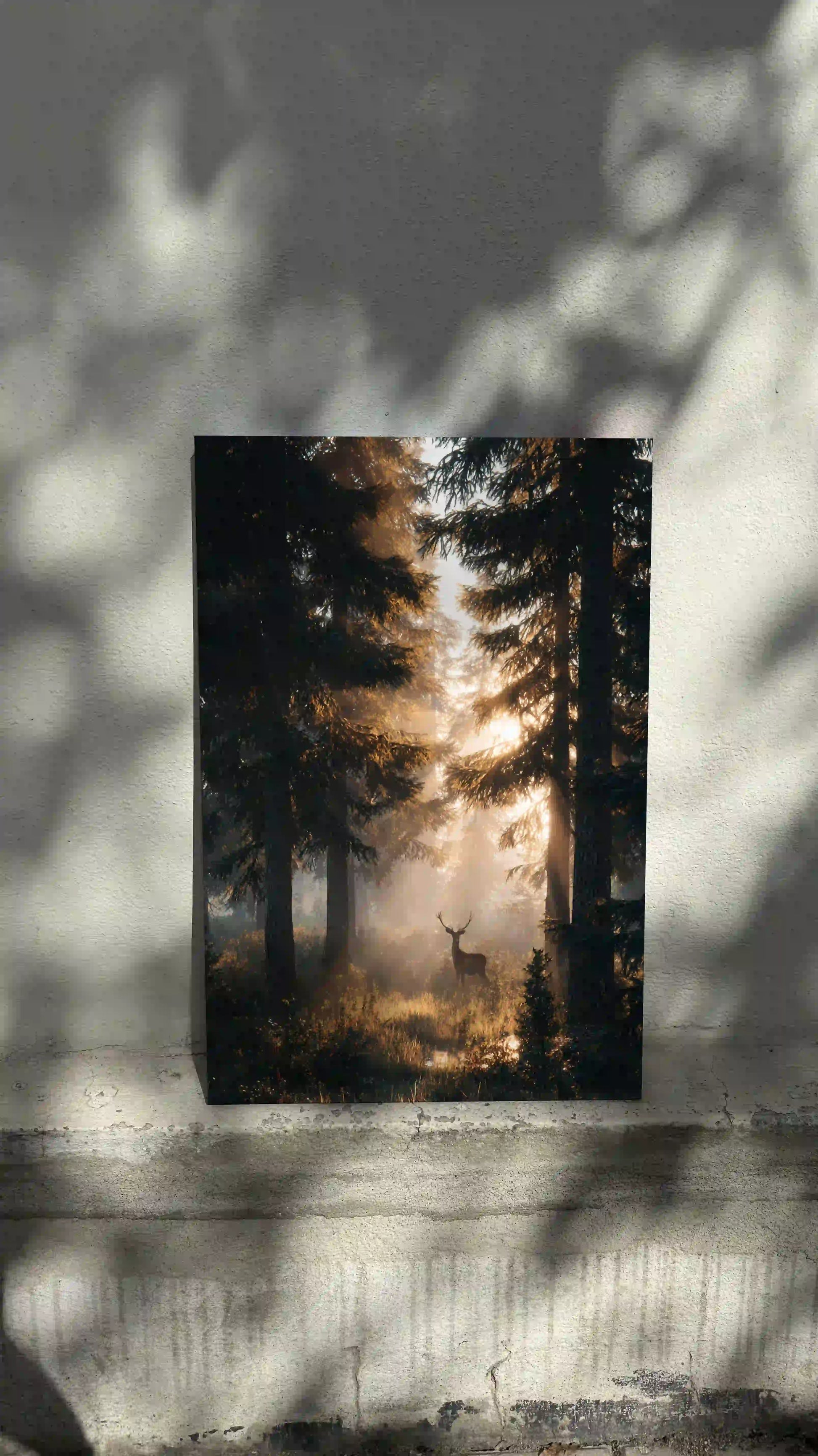 🌲Wyobraź sobie, że wchodzisz do pokoju, w którym złote promienie poranka przenikają przez wysokie sosny, a w ich centrum stoi jeleń — spokojny, dostojny, obecny. Czujesz, jak przestrzeń wokół Ciebie napełnia się ciszą, światłem i naturalnym rytmem. Ten obraz nie tylko zdobi — on tworzy miejsce, w którym naprawdę można odetchnąć głęboko.