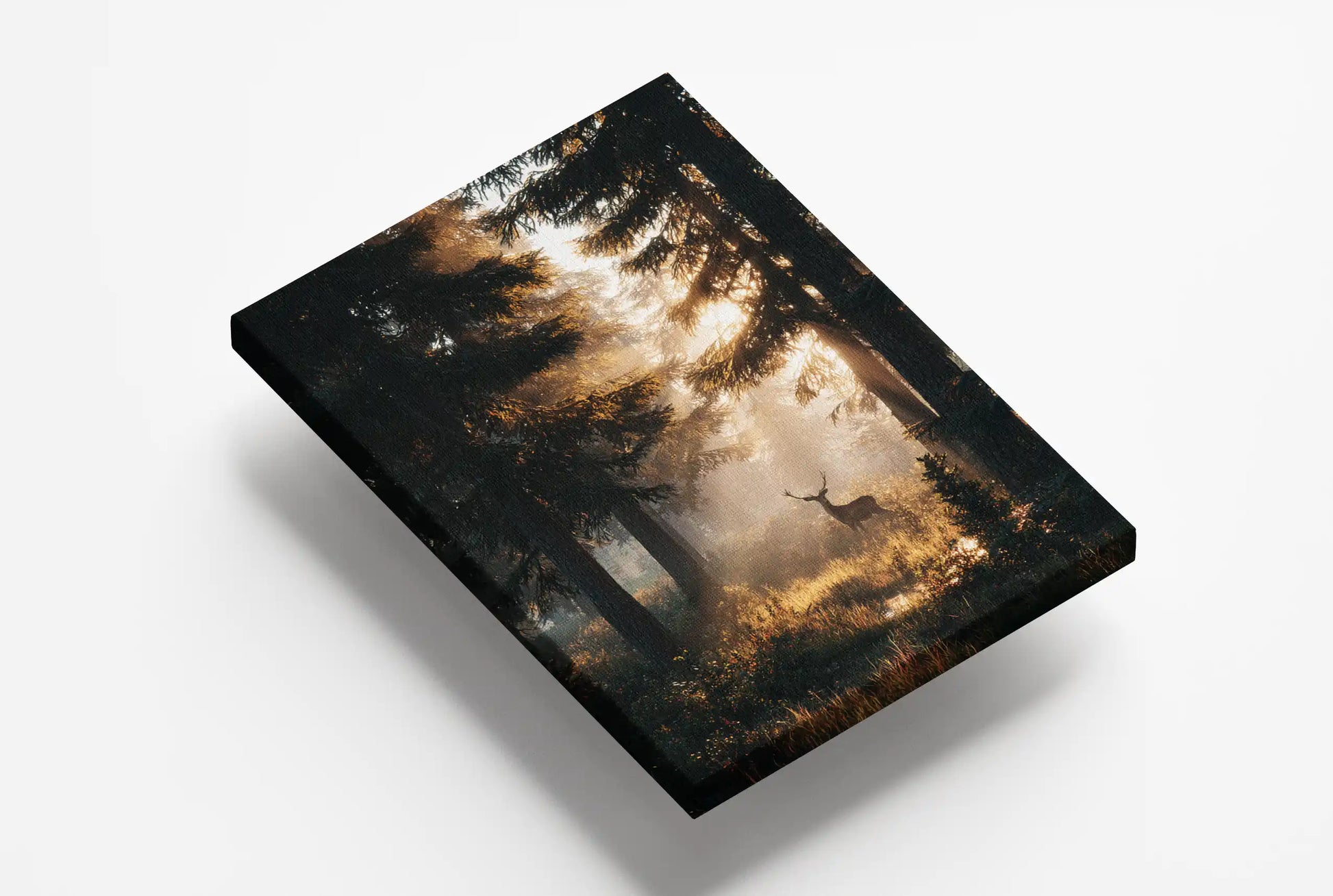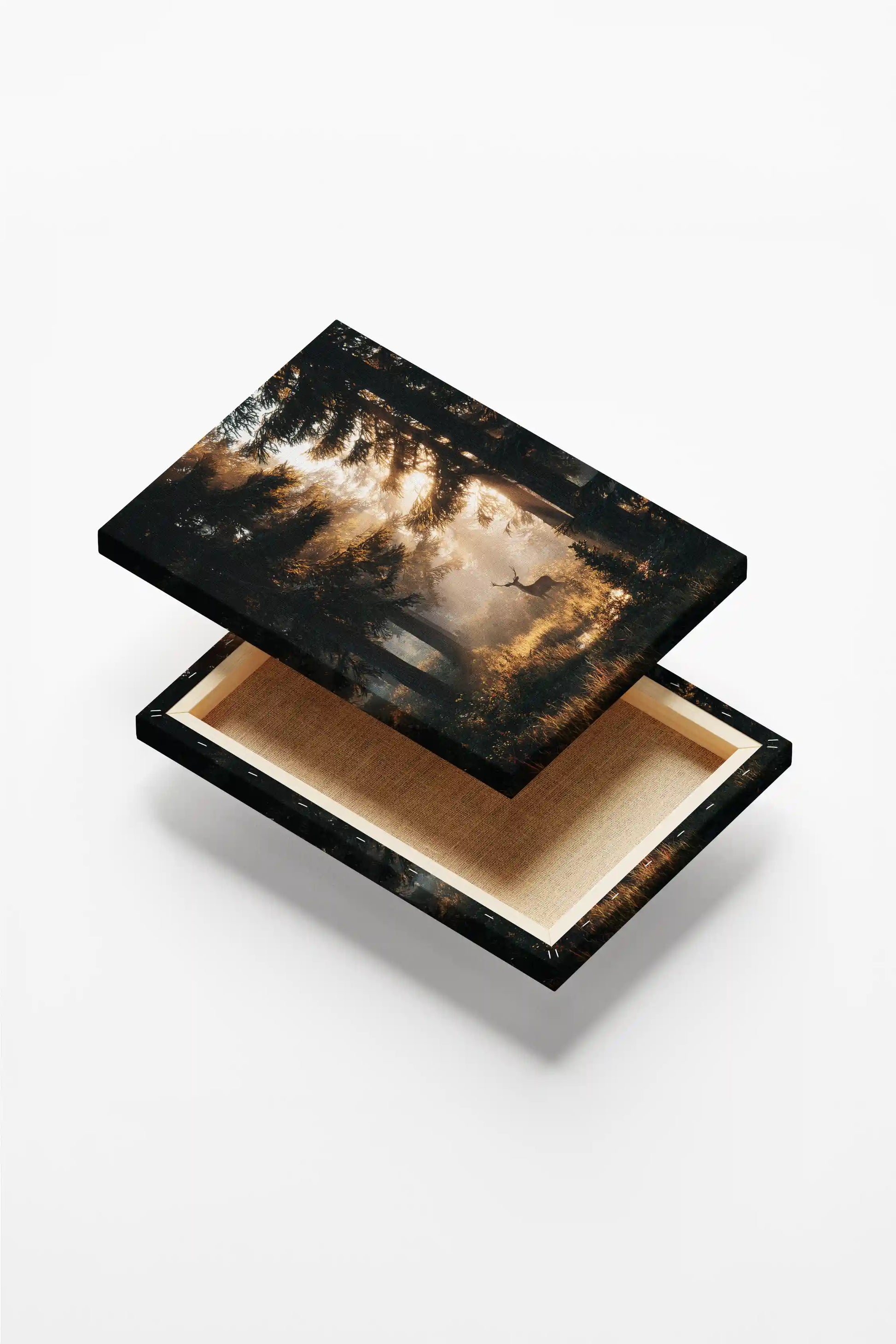 Obraz na płótnie stworzony z myślą, że wnętrze może stać się azylem ciszy, światła i naturalnej harmonii. Kompozycja z jeleniem w złotym lesie wprowadza atmosferę spokoju, kontemplacji i subtelnej elegancji.