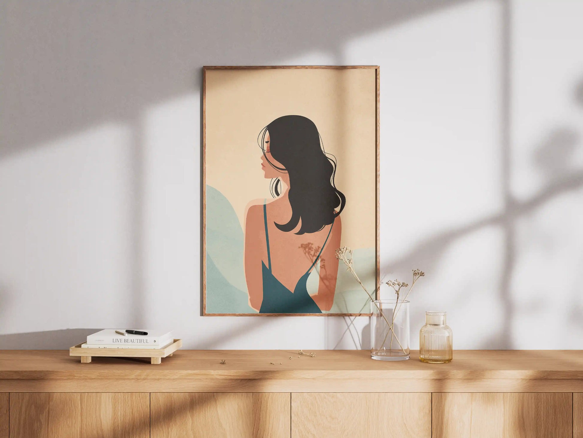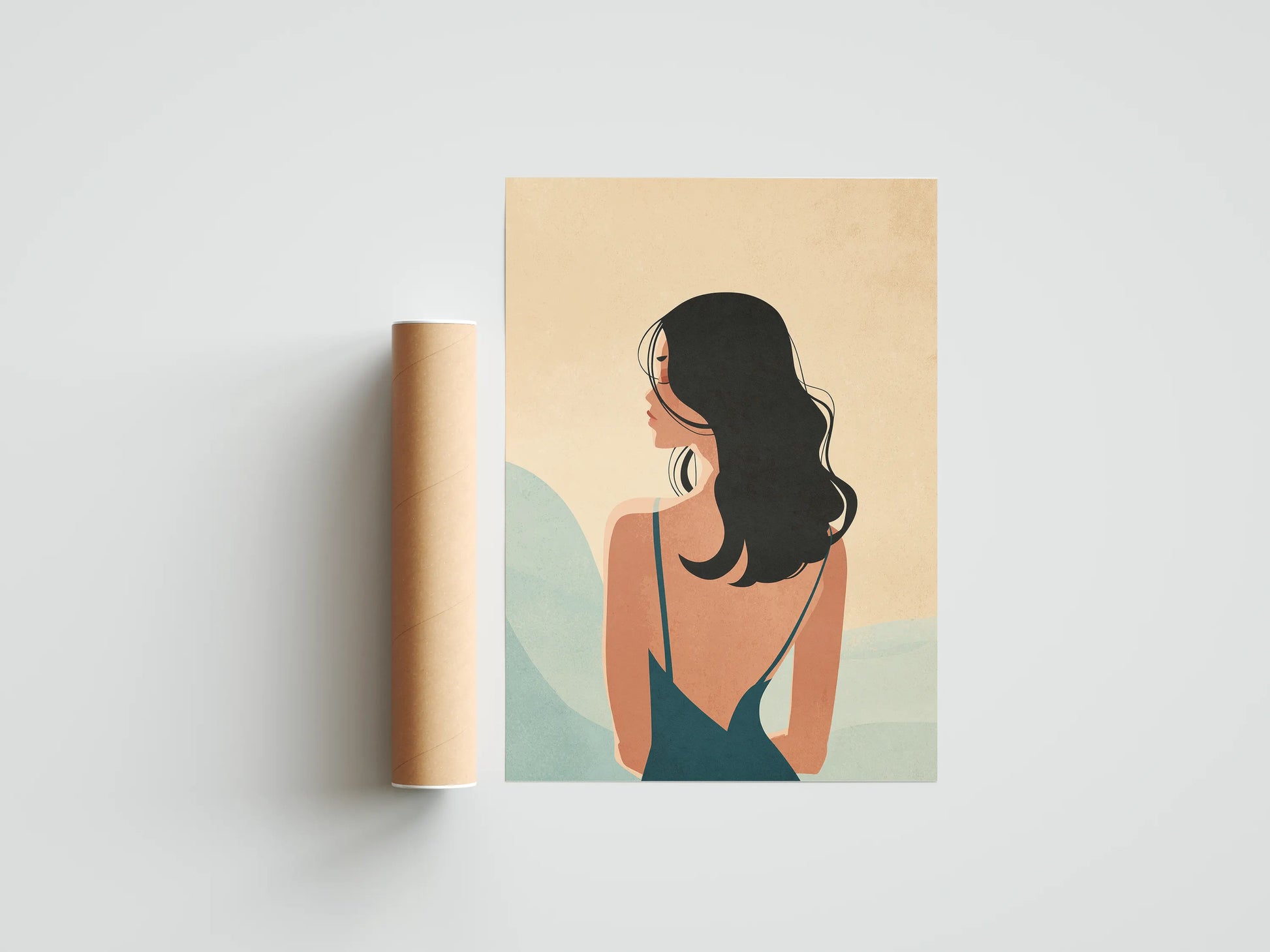 Plakat przedstawia subtelną ilustrację kobiety widzianej od tyłu, z długimi, falującymi czarnymi włosami i odkrytymi ramionami. Jej ciemnoturkusowa sukienka z cienkimi ramiączkami delikatnie opina sylwetkę, podkreślając lekkość i elegancję kompozycji. Tło tworzą miękkie, abstrakcyjne kształty w odcieniach beżu i błękitu, które nadają całości spokojny, minimalistyczny charakter. To obraz, który mówi ciszą. Idealny do wnętrz, które cenią estetykę, kobiecą siłę i subtelność. Plakat emanuje spokojem, klasą i delikatną tajemnicą — jak moment zatrzymany między gestem a myślą. Doskonale sprawdzi się w sypialni, salonie, pracowni czy przestrzeni do relaksu, wprowadzając atmosferę wyrafinowanego spokoju.