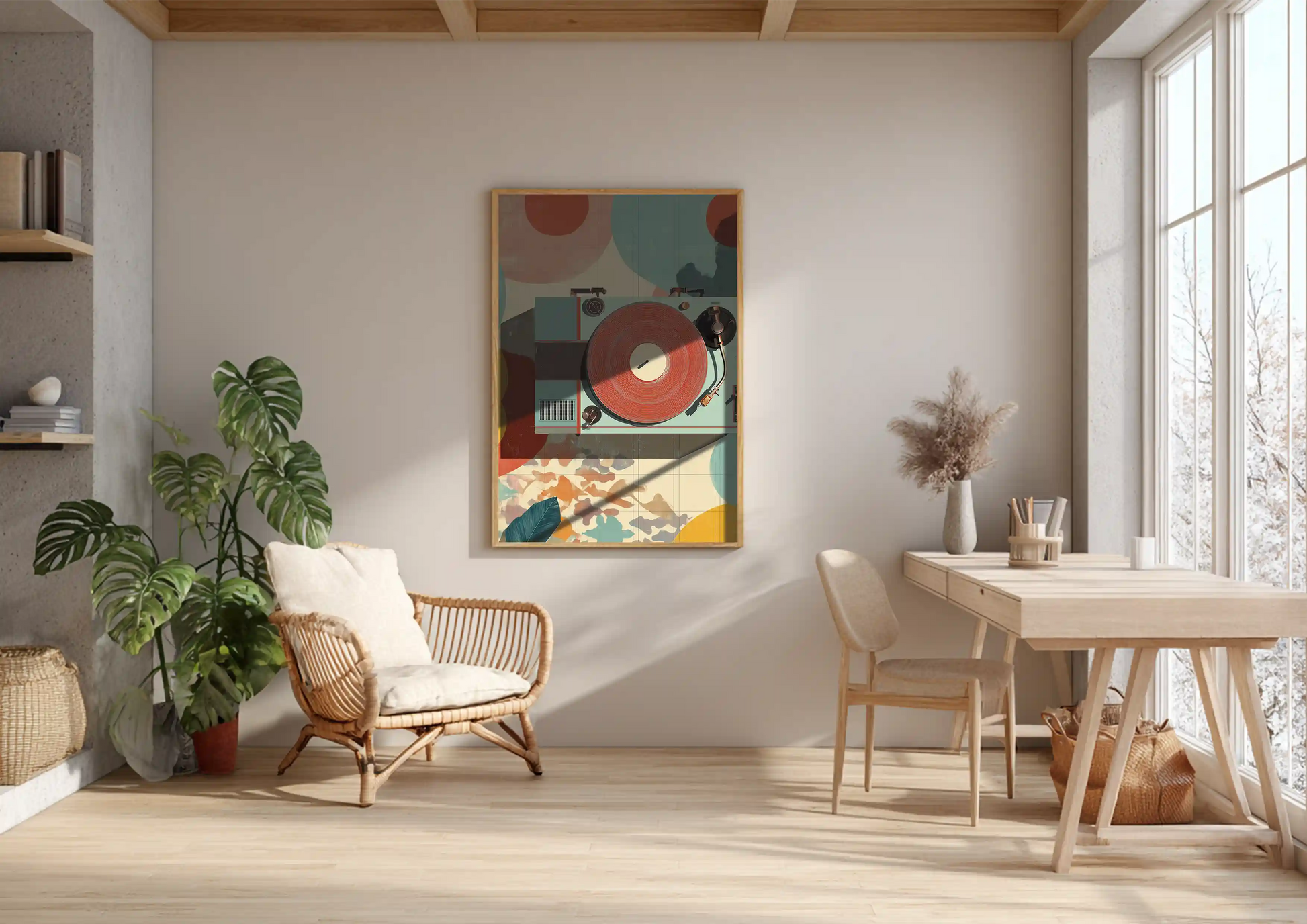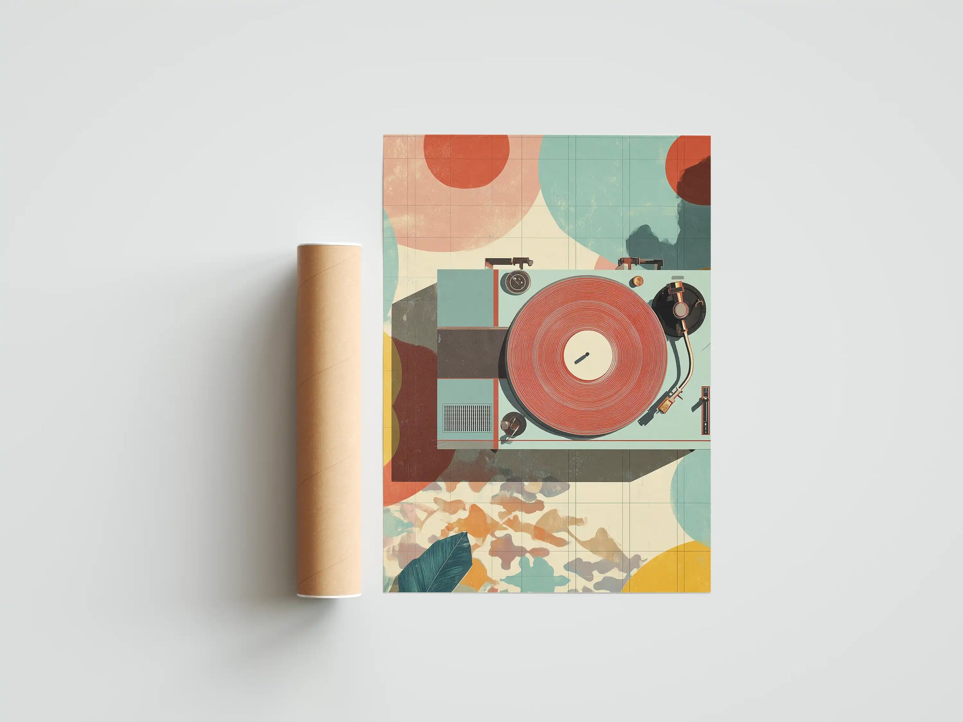 Plakat ukazuje stylizowaną ilustrację vintage'owego gramofonu z czerwonym winylem, widzianego z góry. To nie tylko hołd dla analogowego brzmienia, ale także wizualna uczta dla miłośników designu. Tło wypełniają abstrakcyjne kształty i żywe kolory, które tworzą dynamiczną, niemal rytmiczną kompozycję. W dolnym rogu pojawia się duży liść, dodając naturalnego kontrapunktu do geometrycznych form. Ten plakat łączy w sobie nostalgię z nowoczesnością, muzykę z obrazem, emocje z estetyką. Idealnie sprawdzi się jako dekoracja w przestrzeniach kreatywnych, pokojach muzycznych, kawiarniach czy salonach z duszą. Wprowadza energię, styl i odrobinę retro klimatu, który nigdy nie wychodzi z mody.