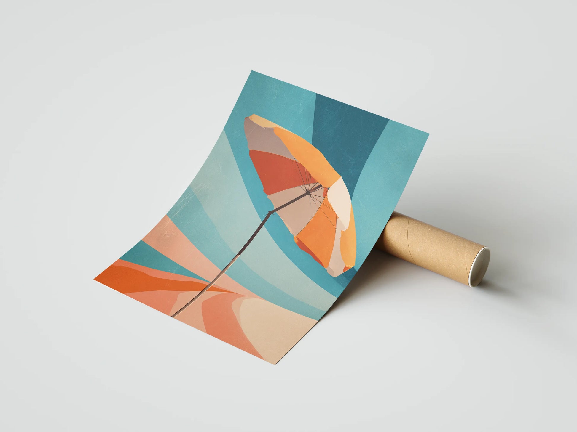 Plakat przedstawia stylizowaną scenę plażową, w której główną rolę gra duży parasol o panelach w odcieniach pomarańczu, żółci i bieli. Osadzony na smukłym białym słupku, parasol góruje nad abstrakcyjnym tłem pełnym miękkich, zakrzywionych pasów kolorów — błękitu, różu, beżu i pomarańczu. Kompozycja przypomina słoneczny dzień nad morzem, uchwycony w nowoczesnej, graficznej formie. To plakat, który wprowadza do wnętrza klimat lata, relaksu i beztroski. Idealnie sprawdzi się w przestrzeniach, które potrzebują odrobiny koloru i pozytywnej energii — w salonie, łazience, domku letniskowym czy pracowni. Jego minimalistyczna forma i żywa paleta barw sprawiają, że przyciąga wzrok i poprawia nastrój, niezależnie od pory roku.