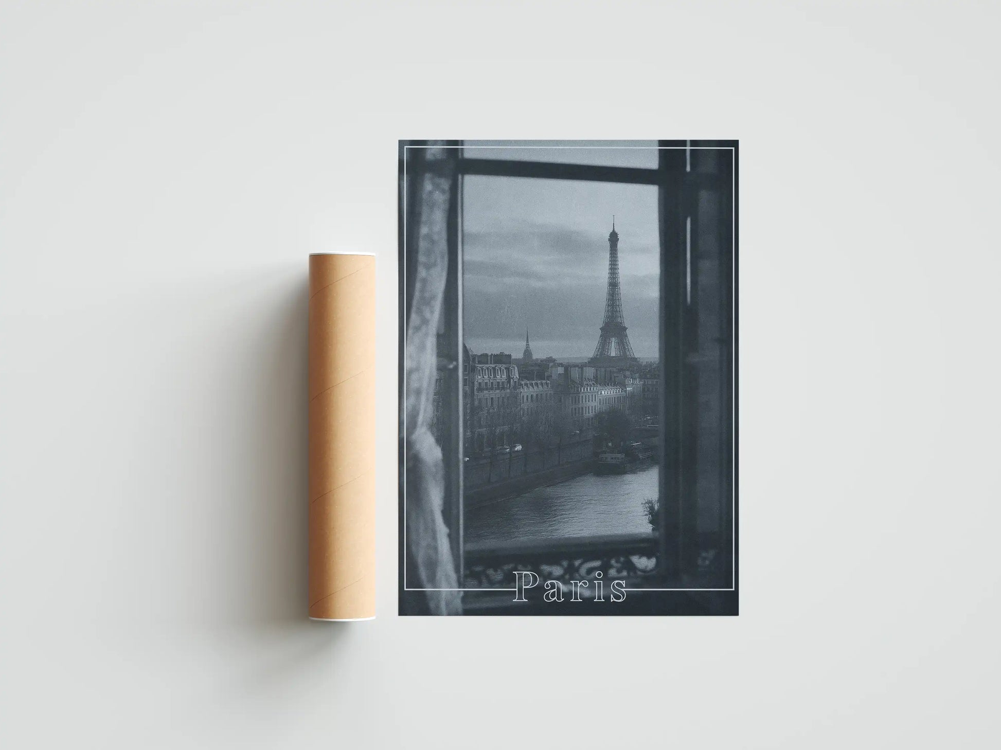 Ten plakat to elegancka, czarno-biała kompozycja, która uchwyca esencję paryskiego romantyzmu i ponadczasowej architektury. Przedstawia widok na Wieżę Eiffla, widzianą przez okno budynku, co nadaje scenie intymny, niemal filmowy charakter. Za oknem rozciąga się panorama miasta z Sekwaną i klasycznymi paryskimi kamienicami, a łódź sunąca po rzece dodaje scenie życia i ruchu.