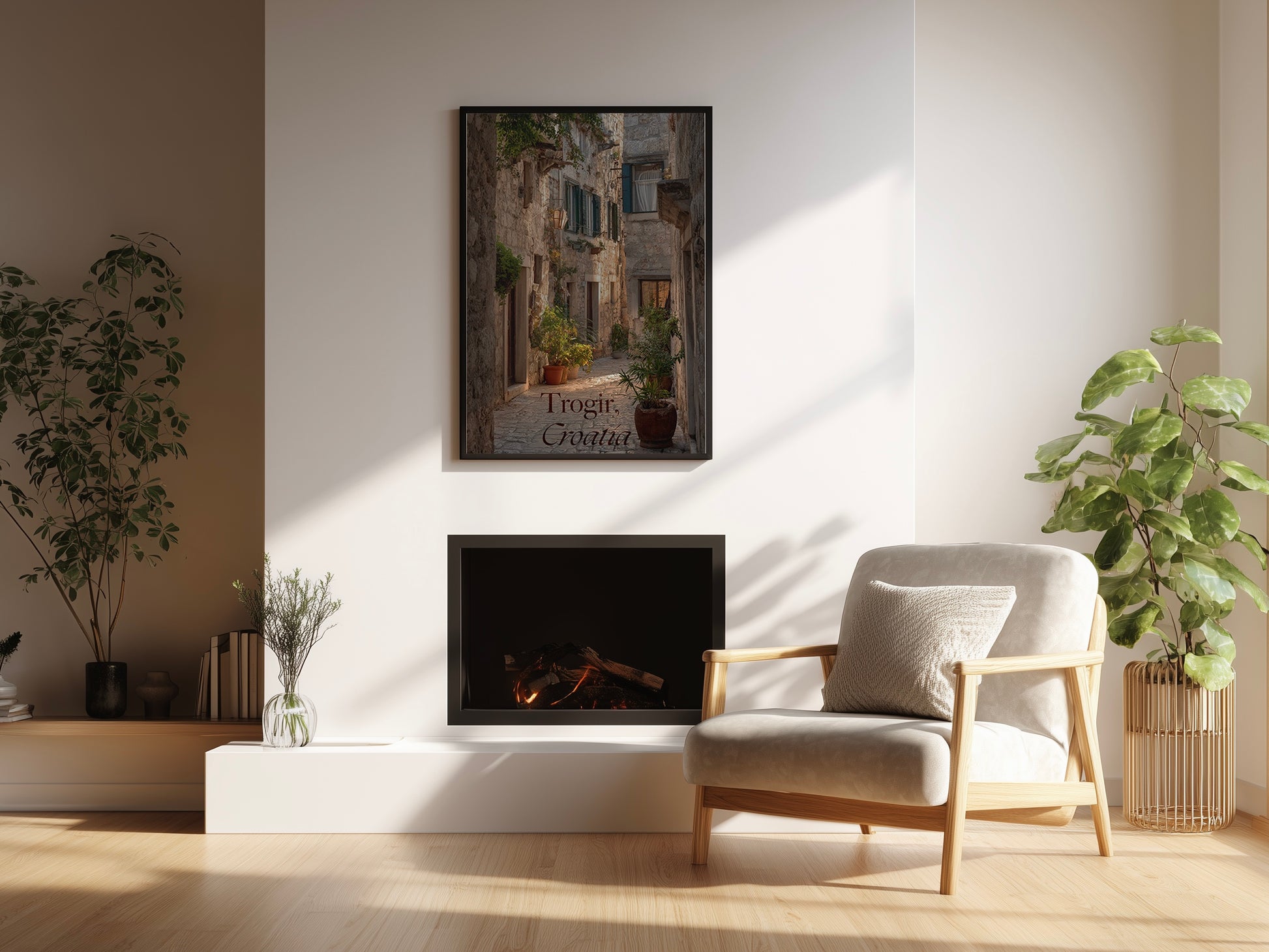 Ten plakat to wizualna podróż do serca Dalmacji — wąska, kamienna uliczka Trogiru zachwyca rustykalnym urokiem i spokojem południowego słońca. Otoczona zabytkowymi murami z jasnego kamienia, z drewnianymi okiennicami i bujną zielenią w donicach, tworzy atmosferę, która koi zmysły i przywołuje wspomnienia letnich spacerów. Ciepłe światło subtelnie podkreśla fakturę ścian i rzuca miękkie cienie, nadając scenie głębię i romantyzm. Delikatny napis „Trogir, Croatia” u dołu plakatu dodaje elegancji i podróżniczego charakteru.