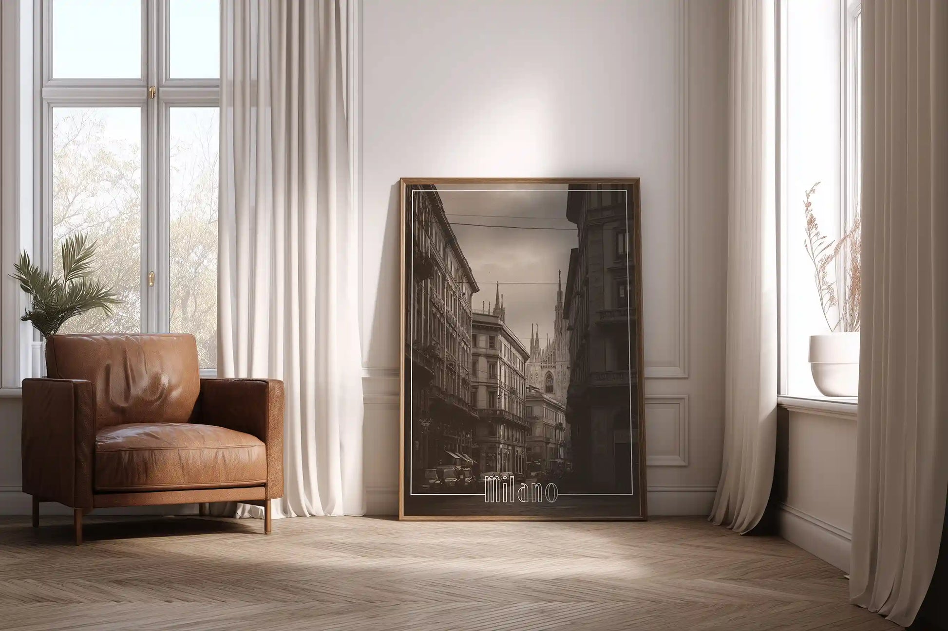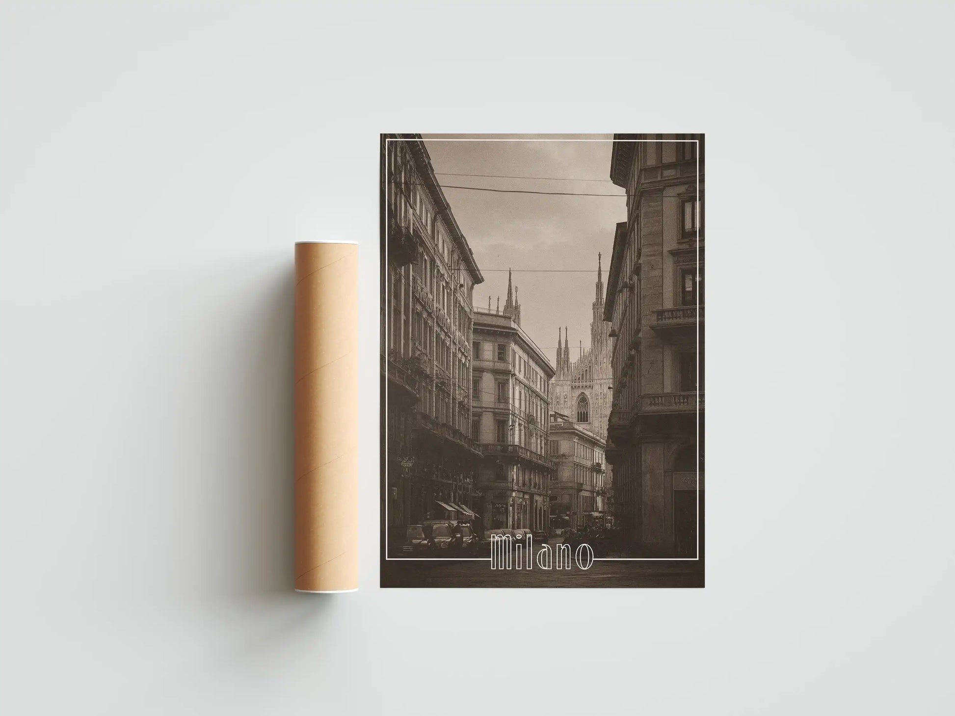 Ten plakat to elegancka podróż w serce Mediolanu — miasta, gdzie historia spotyka się z wyrafinowaną estetyką. Sepiowa tonacja nadaje fotografii ciepły, nostalgiczny klimat, jakby uchwycono chwilę z dawnych lat, kiedy ulice tętniły spokojem i klasą. W centrum kompozycji góruje majestatyczna katedra Duomo di Milano, której strzeliste wieże i misternie zdobiona fasada przyciągają wzrok i budzą podziw.