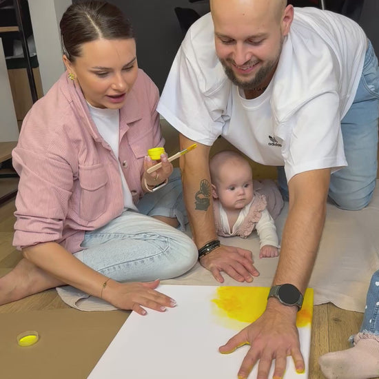Obraz na płótnie stworzony z myślą, że wspólne chwile z dzieckiem mogą stać się trwałą pamiątką i dekoracją pełną emocji. Ten słoneczny motyw z miejscem na odciski dłoni to wyjątkowy sposób na uwiecznienie bliskości i ciepła rodzinnego.